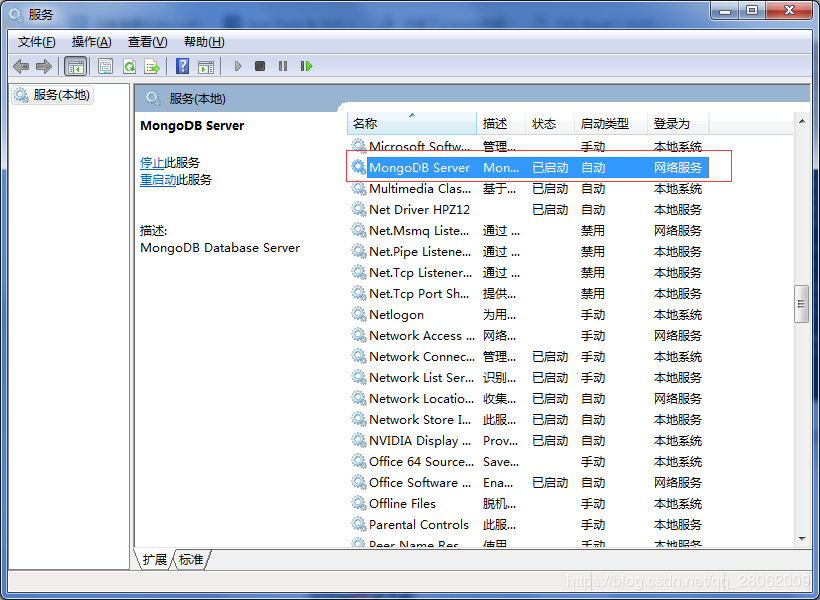 windows+r 输入services.msc 打开服务,寻找mongoDB Server