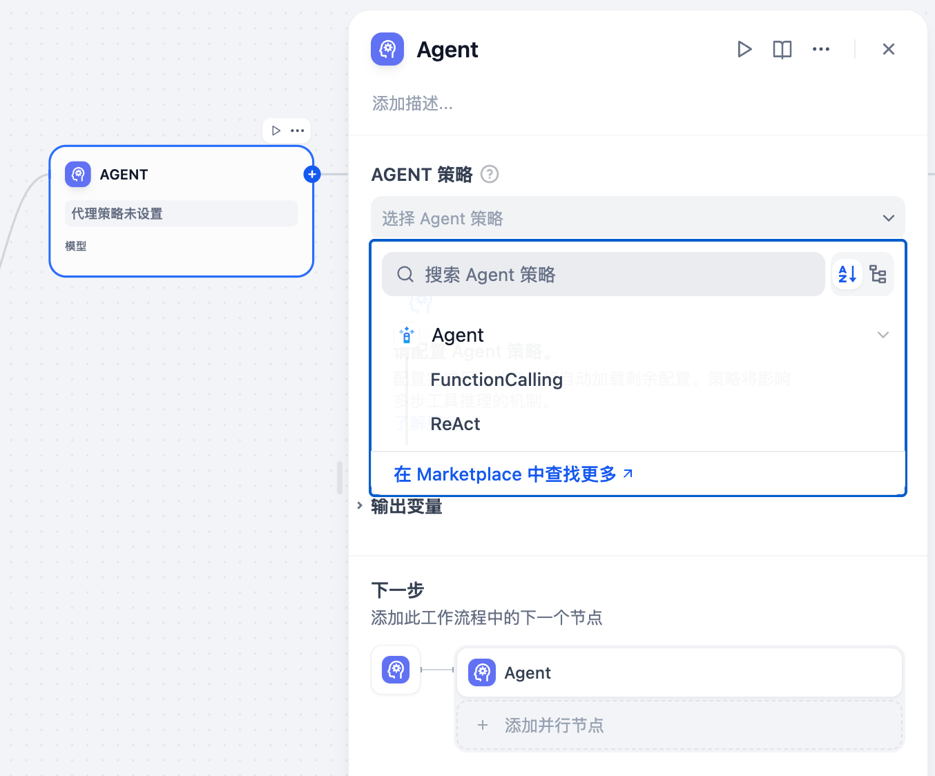 从下拉菜单选择所需的 Agent 推理策略。Dify 内置了 Function Calling 和 ReAct 两种策略,可在 Marketplace → Agent 策略分类中安装使用。