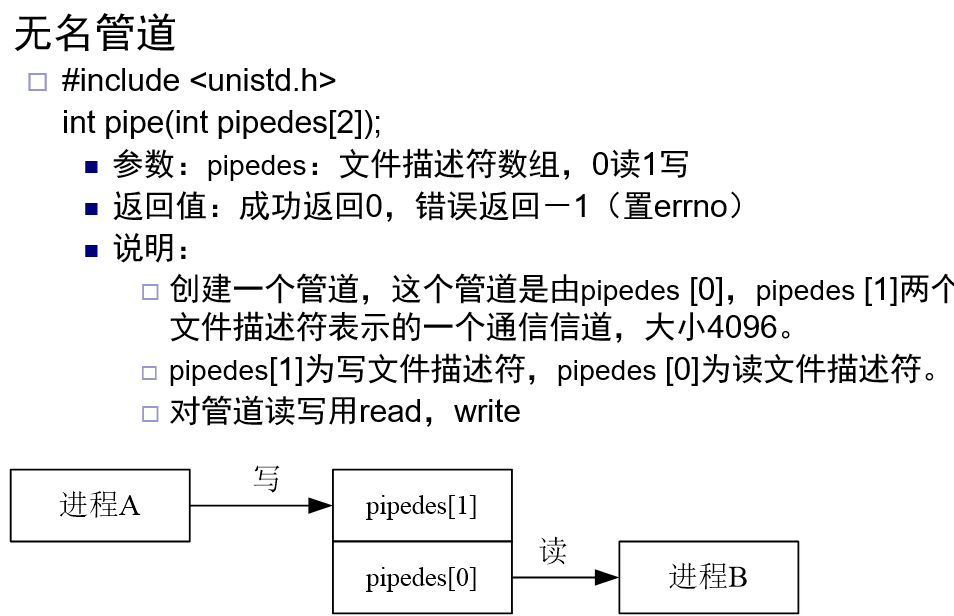 系统调用pipe接收一个具有两个元素的整型数组fds作为参数,pipe成功后返回0,并向fds返回两个文件描述符。fds[0]对应管道读出端,fds[1]对应管道写入端。每个管道都有一个管道缓冲区,大小为4096个字节。可在命令行输入“ulimit -p”查看系统当前管道缓冲区大小,以512字节为单位。(16个缓冲区)