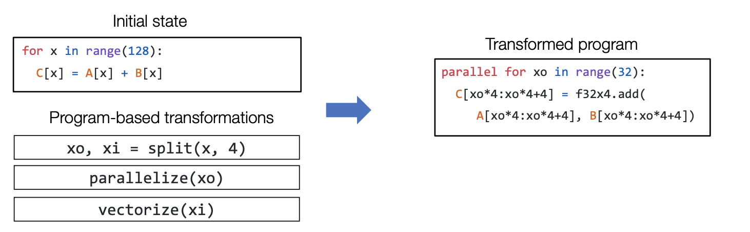 张量程序抽象有一个重要的性质,那就是它能够被一系列程序进行转换,我们可以通过一系列操作(比如循环拆分、并行化、向量化)讲原始的程序变换成新的程序。