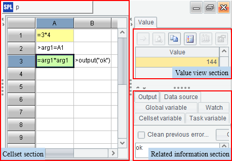 左侧是 Cellset 部分,显示你正在处理的代码的单元集。在右侧的上部区域有 “Value view” 部分,下部区域有 “Related information” 部分,其中 “System information” 部分显示系统输出。”System information” 部分,”Value view” 部分和 “Related information” 部分都可以折叠和展开。