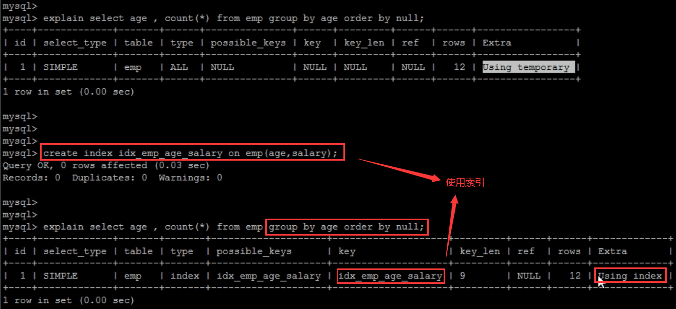 CREATE TABLE `emp` (`id` int(11) NOT NULL AUTO_INCREMENT,`name` varchar(100) NOT NULL,`age` int(3) NOT NULL,`salary` int(11) DEFAULT NULL,PRIMARY KEY (`id`)) ENGINE=InnoDB DEFAULT CHARSET=utf8mb4;insert into `emp` (`id`, `name`, `age`, `salary`) values('1','Tom','25','2300');insert into `emp` (`id`, `name`, `age`, `salary`) values('2','Jerry','30','3500');insert into `emp` (`id`, `name`, `age`, `salary`) values('3','Luci','25','2800');insert into `emp` (`id`, `name`, `age`, `salary`) values('4','Jay','36','3500');insert into `emp` (`id`, `name`, `age`, `salary`) values('5','Tom2','21','2200');insert into `emp` (`id`, `name`, `age`, `salary`) values('6','Jerry2','31','3300');insert into `emp` (`id`, `name`, `age`, `salary`) values('7','Luci2','26','2700');insert into `emp` (`id`, `name`, `age`, `salary`) values('8','Jay2','33','3500');insert into `emp` (`id`, `name`, `age`, `salary`) values('9','Tom3','23','2400');insert into `emp` (`id`, `name`, `age`, `salary`) values('10','Jerry3','32','3100');insert into `emp` (`id`, `name`, `age`, `salary`) values('11','Luci3','26','2900');insert into `emp` (`id`, `name`, `age`, `salary`) values('12','Jay3','37','4500');create index idx_emp_age_salary on emp(age,salary);