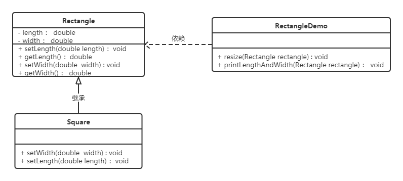 类RectangleDemo是我们的软件系统中的一个组件,它有一个resize方法依赖基类Rectangle,resize方法是RectandleDemo类中的一个方法,用来实现宽度逐渐增长的效果。