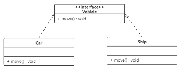 在 UML 类图中,实现关系使用带空心三角箭头的虚线来表示,箭头从实现类指向接口。例如,汽车和船实现了交通工具,其类图如下所示: