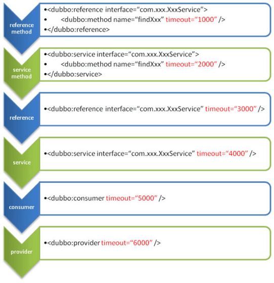 <!-- 全局超时配置 --><dubbo:provider timeout="5000" /><!-- 指定接口以及特定方法超时配置 --><dubbo:provider interface="com.foo.BarService" timeout="2000"><dubbo:method name="sayHello" timeout="3000" /></dubbo:provider>