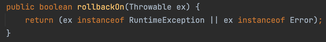 可以看到对异常类型做了判断,根据返回的结果来决定是否会滚事务,会调用到如下方法进行判断RuleBasedTransactionAttribute#rollbackOn