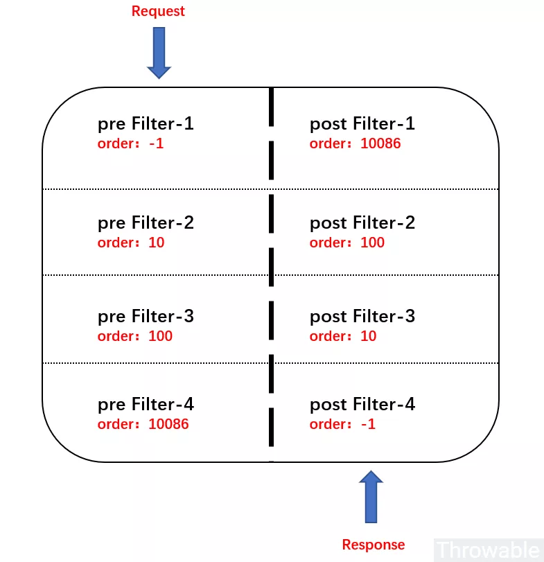 注意,由于过滤器有pre和post两种类型,pre类型过滤器如果order值越小,那么它就应该在pre过滤器链的顶层,post类型过滤器如果order值越小,那么它就应该在pre过滤器链的底层。示意图如下: