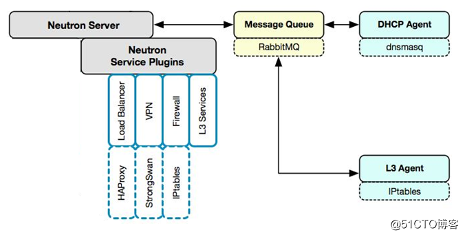 Neutron Server,Plugin 和 Agent 之间通过 Messaging Queue 消息队列通信和调用。