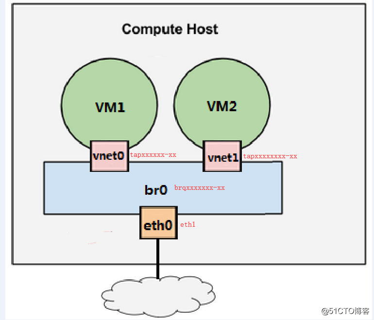 类似上面的架构,br0 由 neutron 创建,使用的名称是类似 brq8c8dcd81-d3 这样的,端口 vnet0 也由 neutron 创建,其名称类似 tapfdf3a9b5-f8 这样的,其中包含有由 neutron service plugin、agent 创建的 ip 地址等信息。实例启动后,neutron 会将该端口分配给实例。