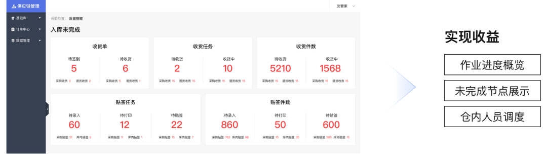 对于仓库内的员工作业管理,通过作业任务数据看板可以概览所有工人的工作进度,发现未完成的任务在什么节点产生阻塞,找到对应的操作人解决卡点问题。