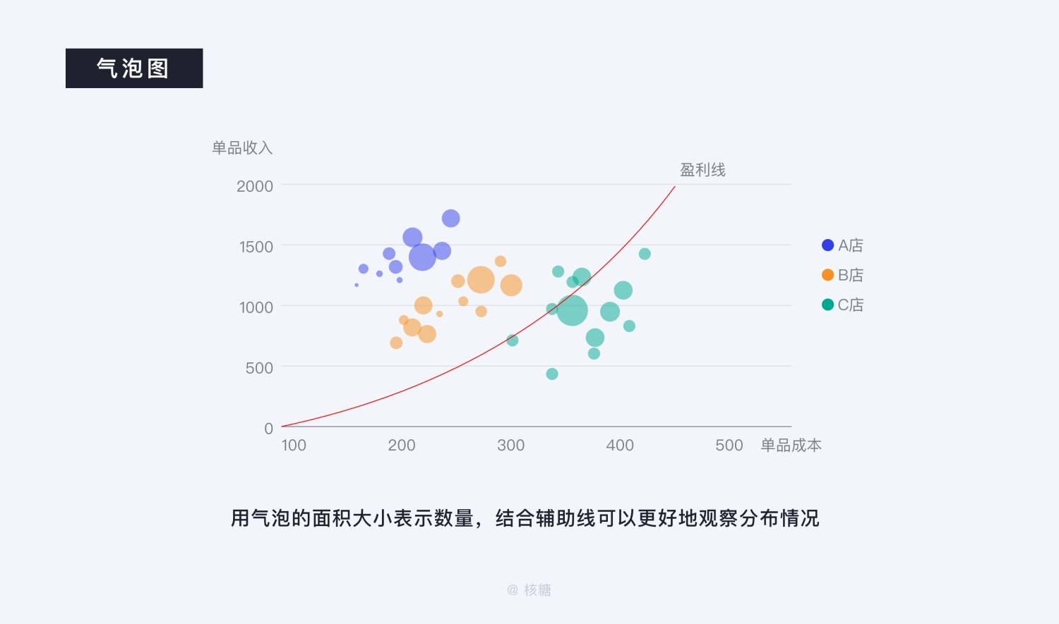 通常色彩在可视化有三个主要用途:区分数据类别、描述量化规律、强调。如下图所示,颜色在其中身兼二职,同时起到了区分类别、量化规律的作用。除此之外,色彩的错误运用也容易引发数据的错误解读。
