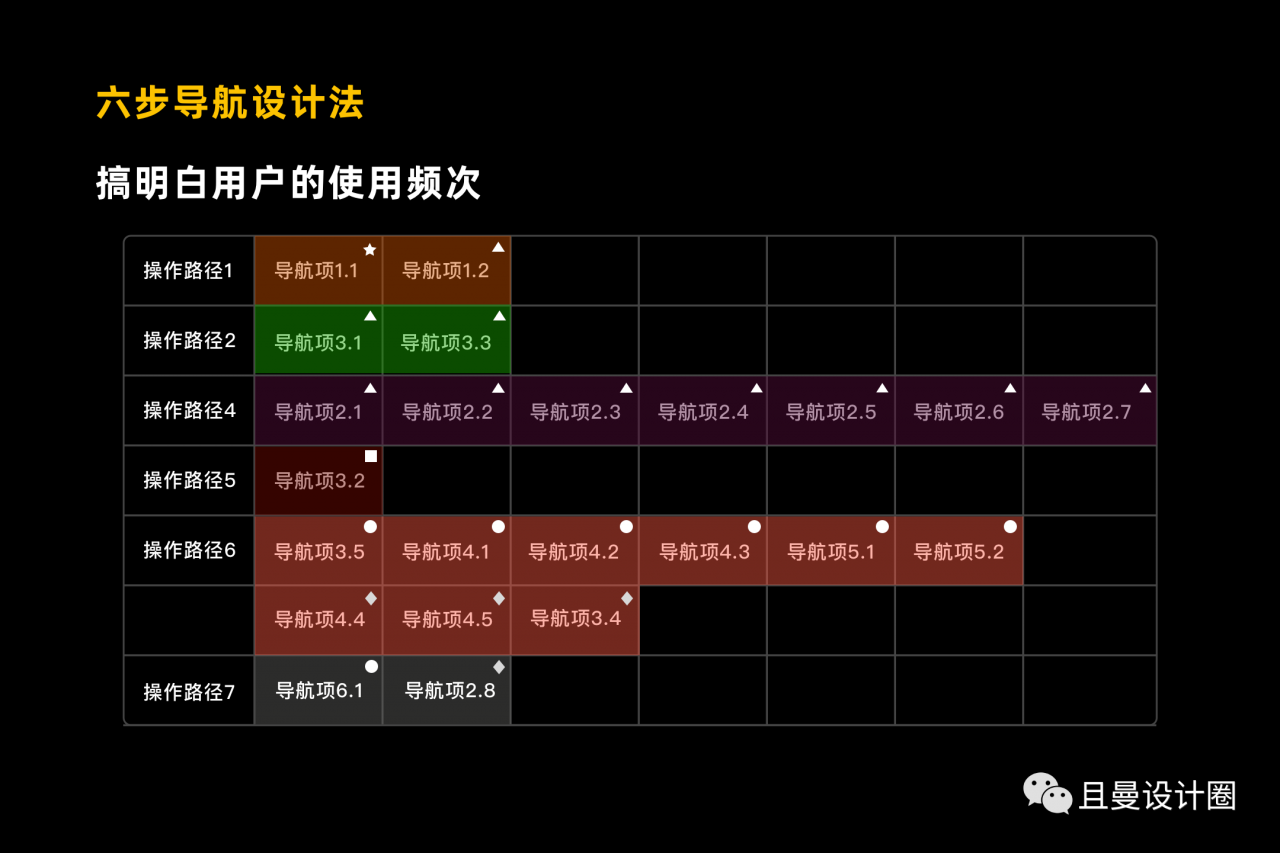 这一步其实是比较好理解的,很简单的法则:“高频次高优展示,低频次降低权重甚至隐藏”这是针对于二级导航中每个导航项的排布进行的设计。这里不妨把频次由高到低量化成为:实时关注、每天关注、每月关注、很少使用、极少使用这个几个概念,分别用五角星、三角形、矩形、圆形、菱形进行代表。