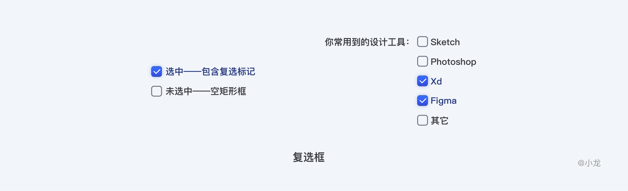 复选框(Checkbox)—— 当有一个或多个独立选项时,用户可以选择任意数量的选项,包括零个、一个或多个。