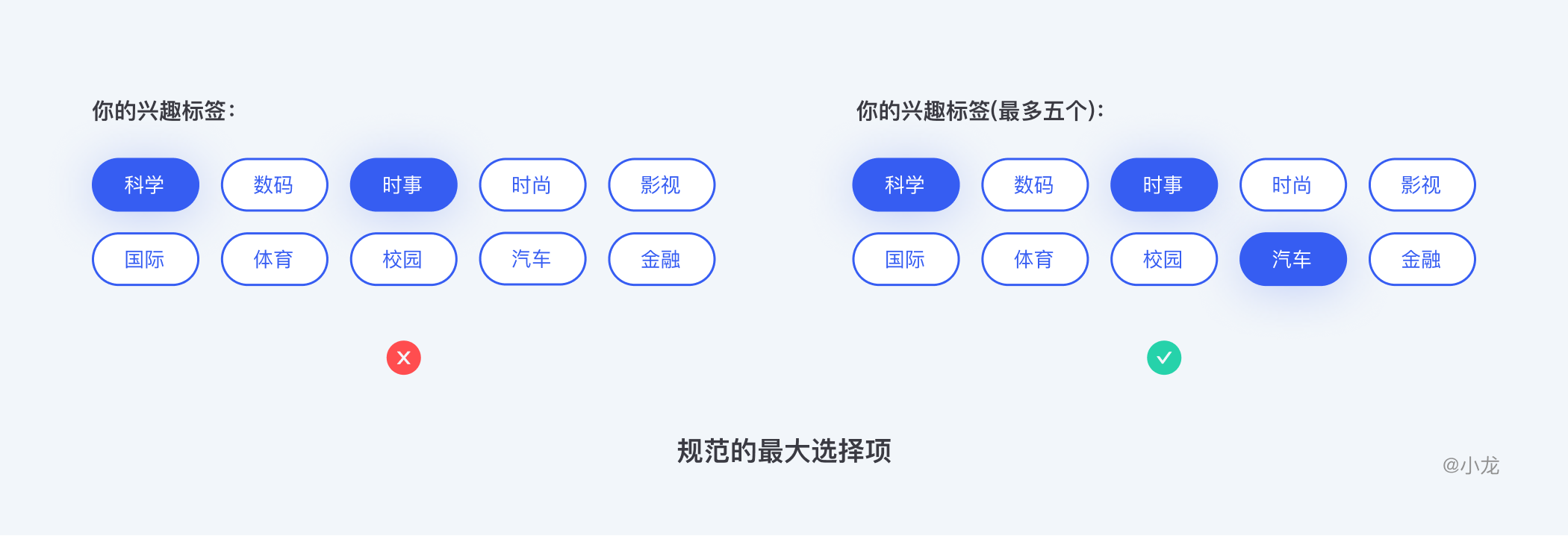 面对多选标签时,面对多个选择项的彼此堆叠,需让让用户知道他们可以选择多少个选项。添加辅助说明,既可以明确它是多选,又可以规范的最大选择项;选项过多时进行标签分类。