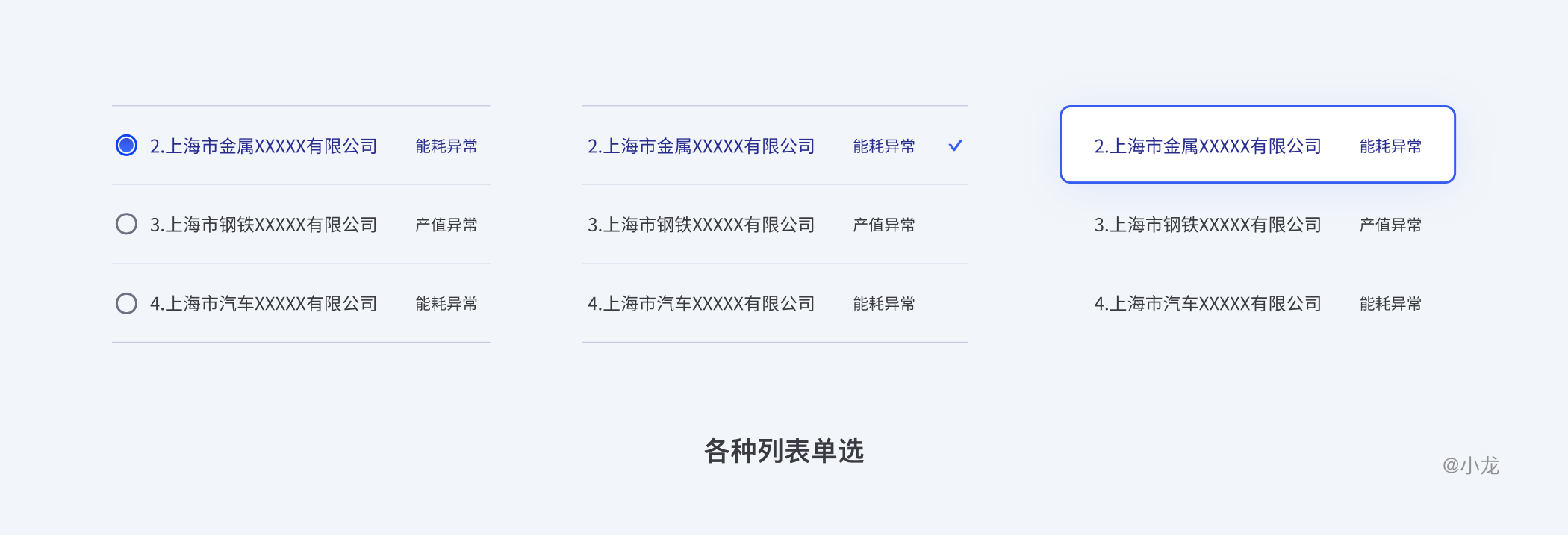 用户只能从互斥选项列表中选择一项。最初的单选按钮被用于列表中超过6个选项时,被设计成垂直方向,圆形轮廓,并摆在列表项的开头,这就是列表单选。现一些设计中,选中被设计成在列表选项外加一个描边框形式或带有背景色,用以节省水平空间。