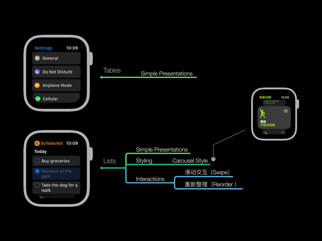 「平」体现在扁平的信息架构。相对于其他平台,watchOS 上的 app 一般仅使用以下 2 种相对简单的信息架构类型: