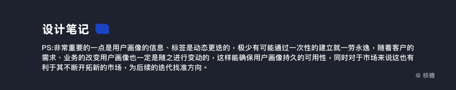 因为用户的需求和业务都是动态变化的,那么对于我们服务供应侧来说对于用户的认知也一定要随时处于一个动态的状态,但凡产品突然满足不了用户的需求了,那么客户随时可能找一个更为合适的替代品,用户的忠诚度就和渣男渣女心一样,都经不起考验,不要抱有任何的幻想,随时对用户保持清醒的认知,对他们的特征进行记录,才能长久的做出贴合其需求的产品,所以用户画像的更新迭代,任重而道远