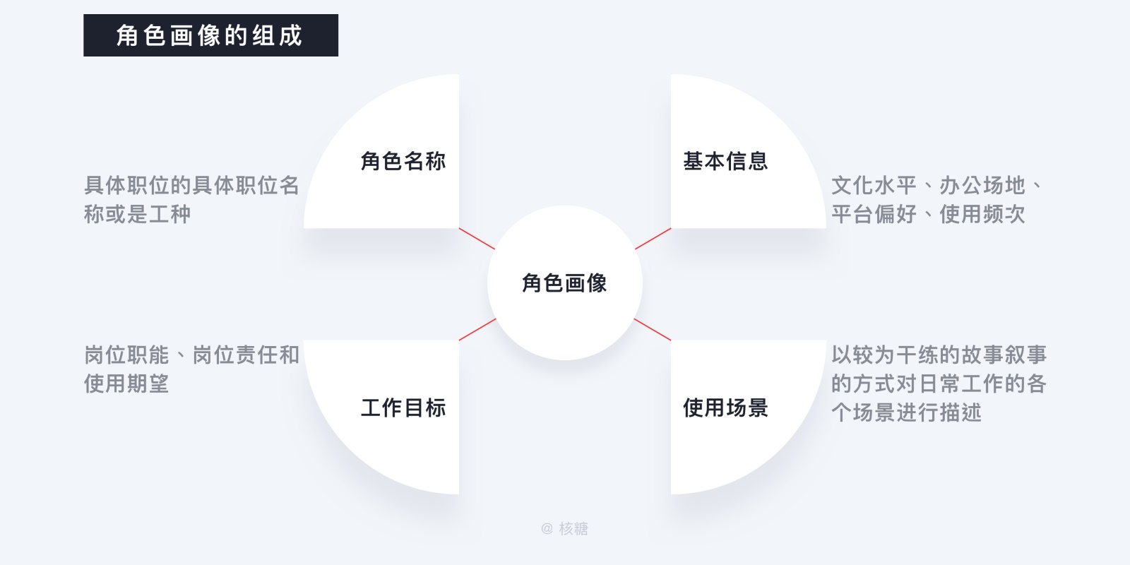 角色画像以一种较为精炼的方式进行拆解可以分为角色名称、基本信息、工作目标、和使用场景,其中具体来说