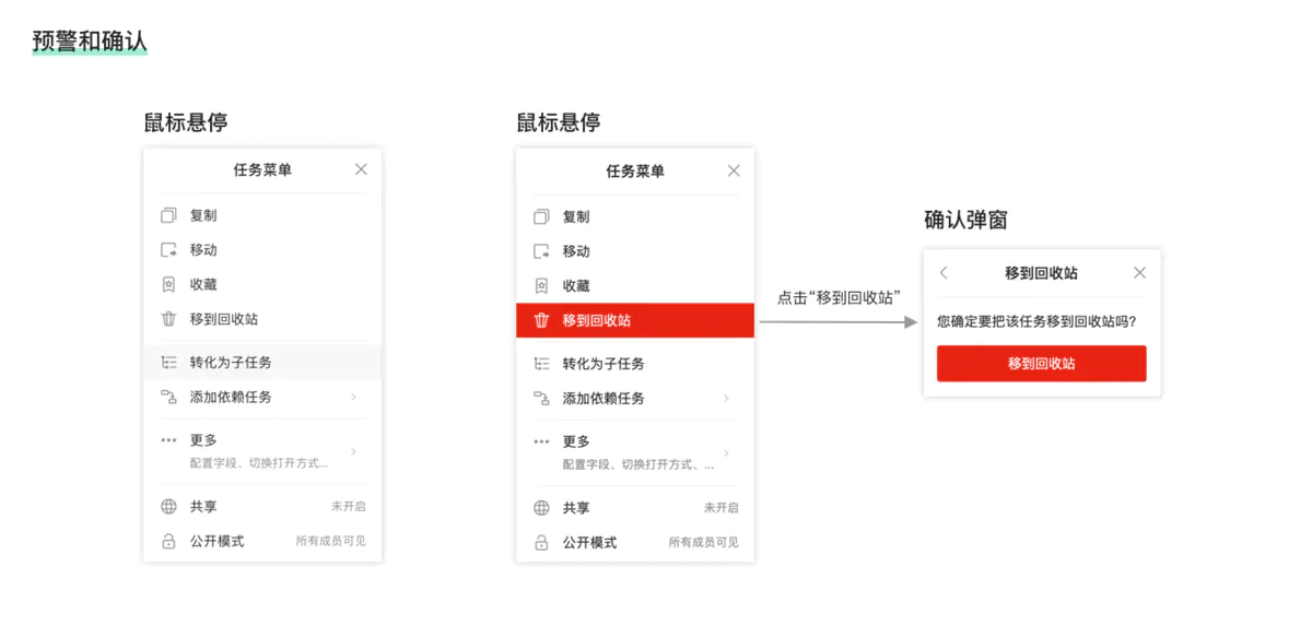 在任务菜单中,当鼠标悬停在非危险操作上时,底色会变成浅灰色;但是,当鼠标悬停在“移到回收站”上时,底色会变成红色,通过醒目的颜色来提示用户,这是一个危险操作,从而降低用户误操作的可能。而当用户点击“移到回收站”时,二次确认的弹窗会弹出,进一步防止用户错误操作。