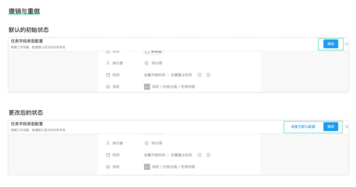 在「任务字段类型配置」的页面中,当用户更改了默认的初始配置后,右上角会出现“恢复为默认配置”的按钮。这是一种支持高效重做的设计思路。