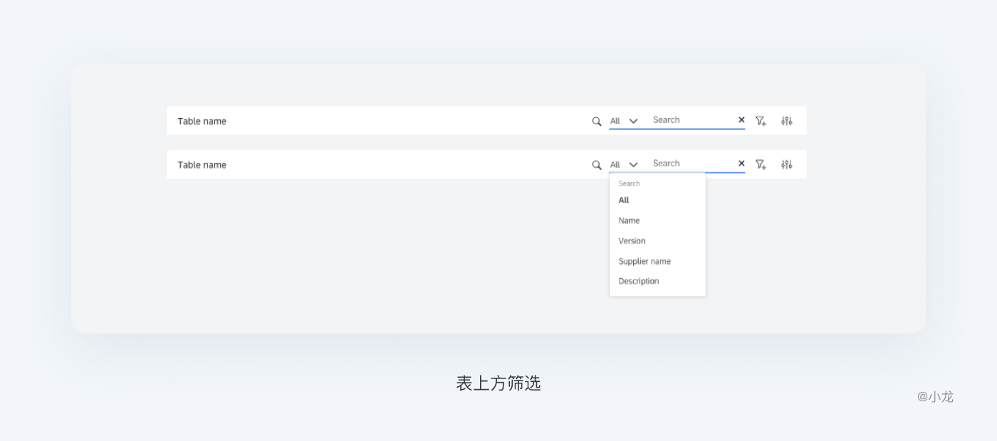 这里特指位于表头的上方的操作区域,包含筛选,操作按钮等其他操作。筛选区包含模糊搜索和条件筛选,按钮分为增删改和其它业务处理操作,合理设计筛选区可以大大提高用户的效率。