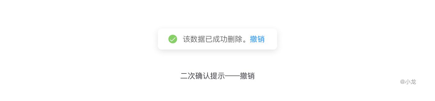 二次确认提示:对于用户操作结果给出提示窗反馈,用户点击「删除」后,直接操作;出现提示框告知用户操作成功,并提供用户「撤销」的按钮;用户进行下一个操作或者15s内不进行任何操作,提示框消失,用户无法再「撤销」。