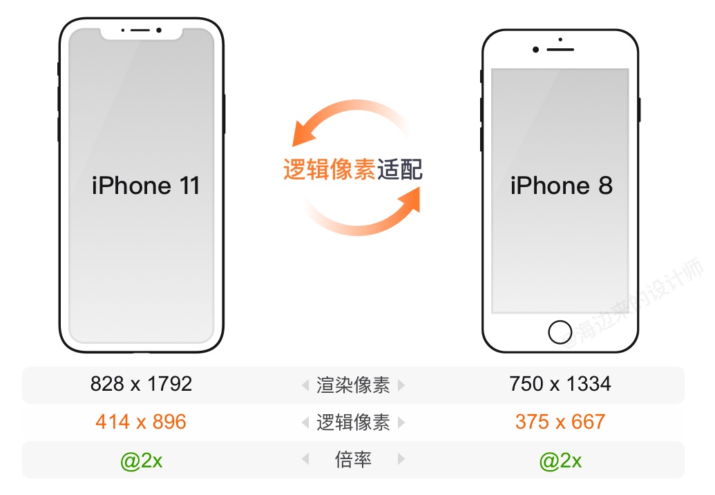 如果两个设备的倍率和逻辑像素都不相同,比如iPhone 8 到 iPhone 11 Pro Max