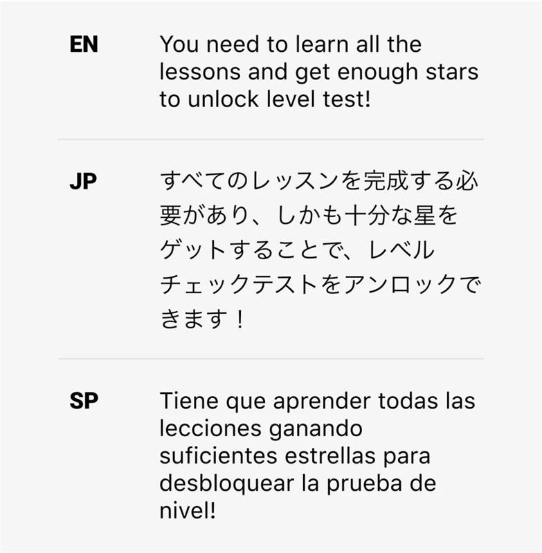 △ 这句短句(为了解锁等级测试,你需要学习完所有课程并获得足够的星星)的日语与西语在占位面积上更是「碾压」英语。