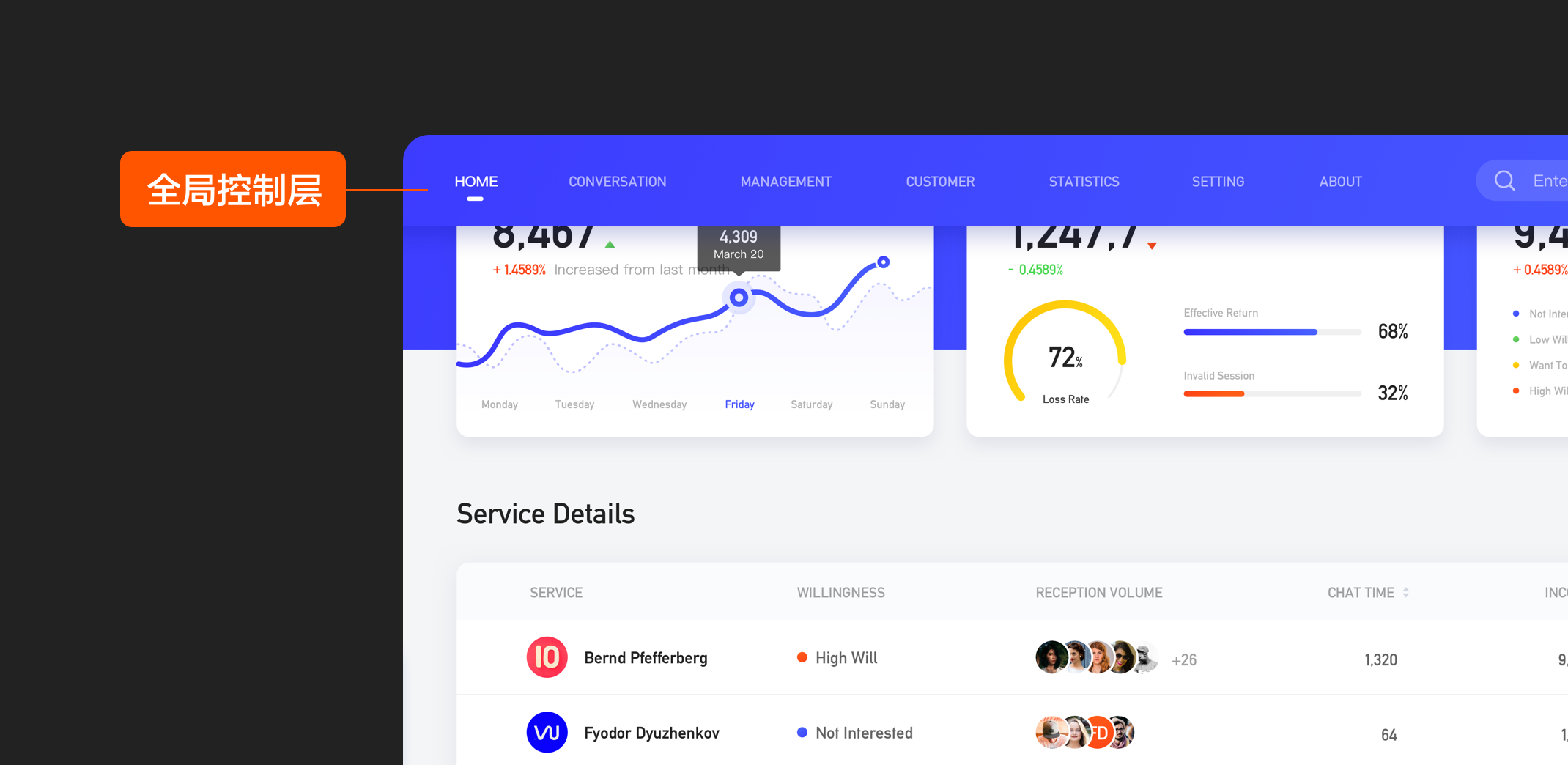 全局控制层我们定义他在内容层之上,属于页面第三层级内容,一般在业务场景中对整个网站的控制以及导航功能如:Header menu、Sidebar menu组件,如下图中Header menu浮在内容层之上。