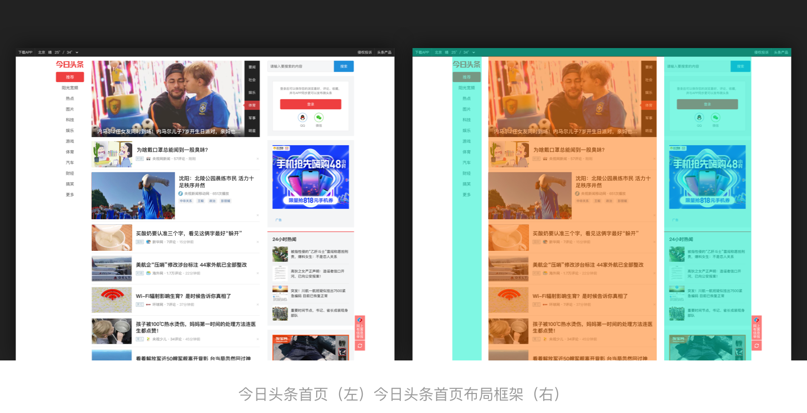 刚刚我们也介绍了视觉层级结构和格式塔理论,接下来简单介绍一下信息框架,它也是在系统布局中需要考虑的内容。信息框架是将信息内容进行组织分层,一个产品的信息框架取决于其特有的业务,他与业务强相关并且需要了解用户群体目标。根据业务和用户目标将内容组织搭建信息框架,形成系统布局的骨架,方便用户在浏览或操作页面时能够快速找到重点内容,提升用户使用效率。我们用今日头条Web端和飞书Web端两个线上产品作为案例分析吧,今日头条和飞书属于两种完全不同类型的产品,那么其信息架构也完全不同。