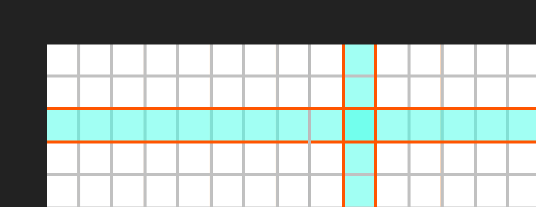 两个相邻的行网格线和两个相邻的列网格线之间的空间属于网格单元格。这是网格系统的一个“单元”。如下图橘黄色的行网格线和列网格线交叉处即是网格单元格。