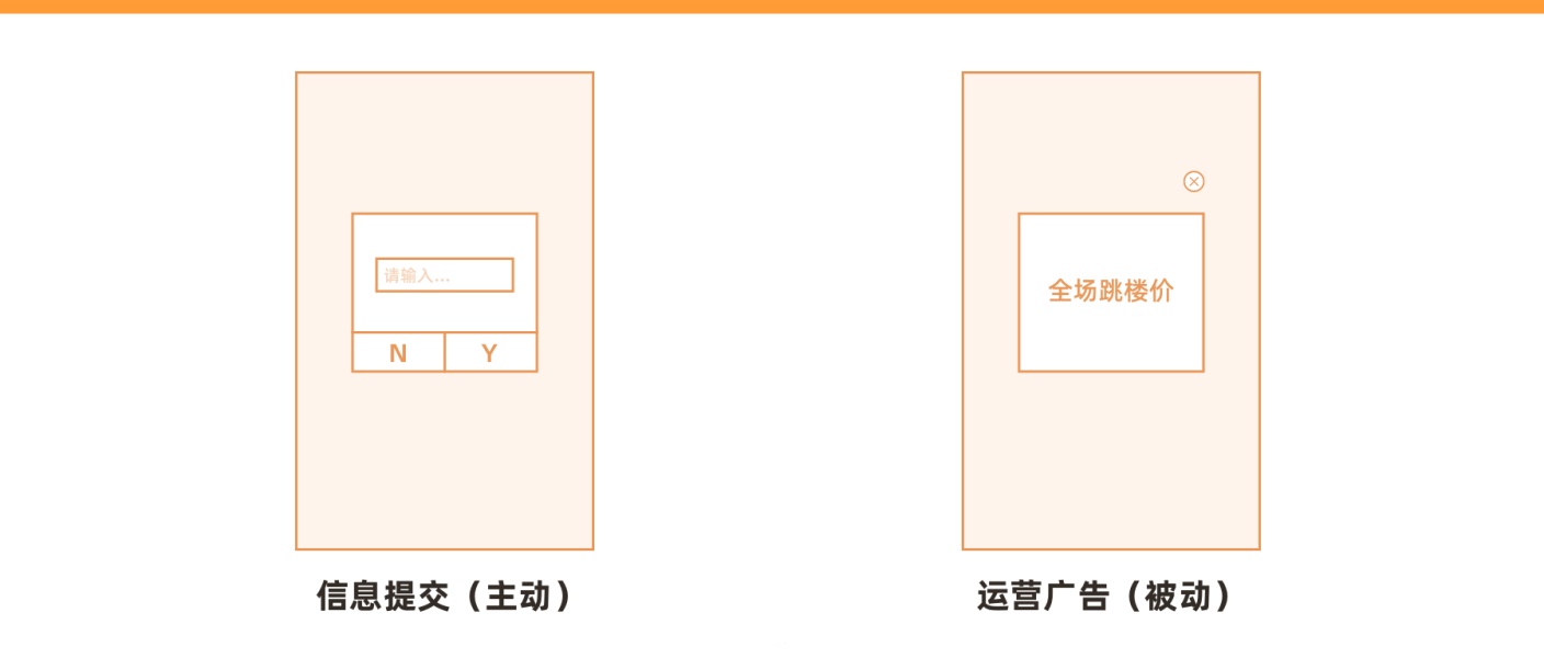 出现在需要打断用户操作的情况下,可以大致分为信息下发(被动)例如:版本更新,消息通知,运营广告等。信息提交(主动),例如:修改信息,登录注册等。