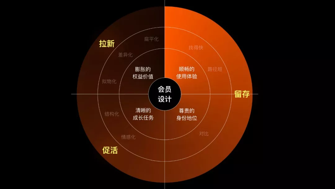 从上面的生命周期可以了解到,会员核心的运营阶段是拉新、促活和留存,所以设计上也聚焦在这3个阶段上。