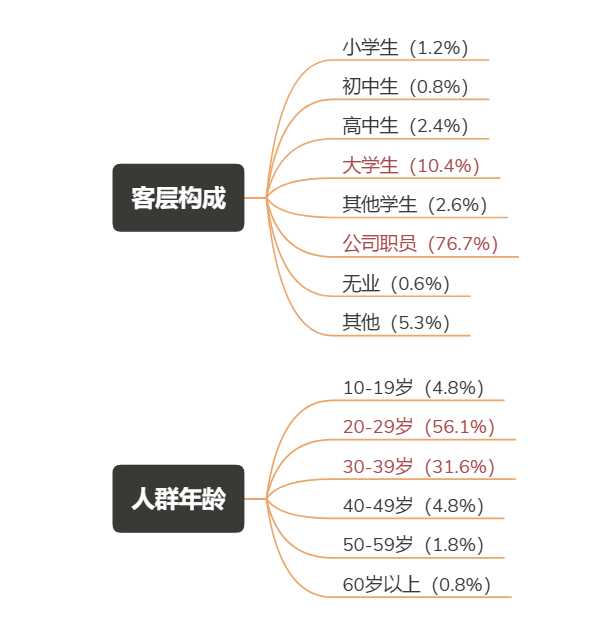 分析: 根据来店的人群年龄与客层构成对客户进行用户价值图呈现,可知20-29岁的公司职员为我们的主要服务人群,以此作为用户调研中选择关键用户的依据