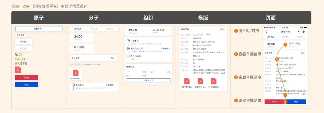 最后,以优化后的核心任务流程为指引,基于原子设计理念,定义页面可拼装的元素,按每个角色对不同事项的关注度排布通用页面,帮助用户准确「获取」审批流的有效信息,完成审批流页面的设计。