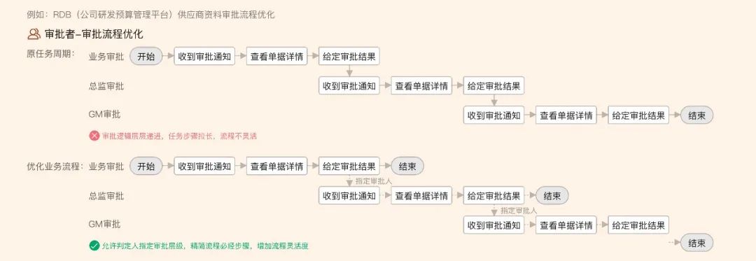 随后,结合前期梳理的「用户目标」和「产品机会点」,明确合适的流程颗粒度,精简非必要步骤,优化核心任务流程。帮助用户便捷「操作」自己要进行的审批任务。