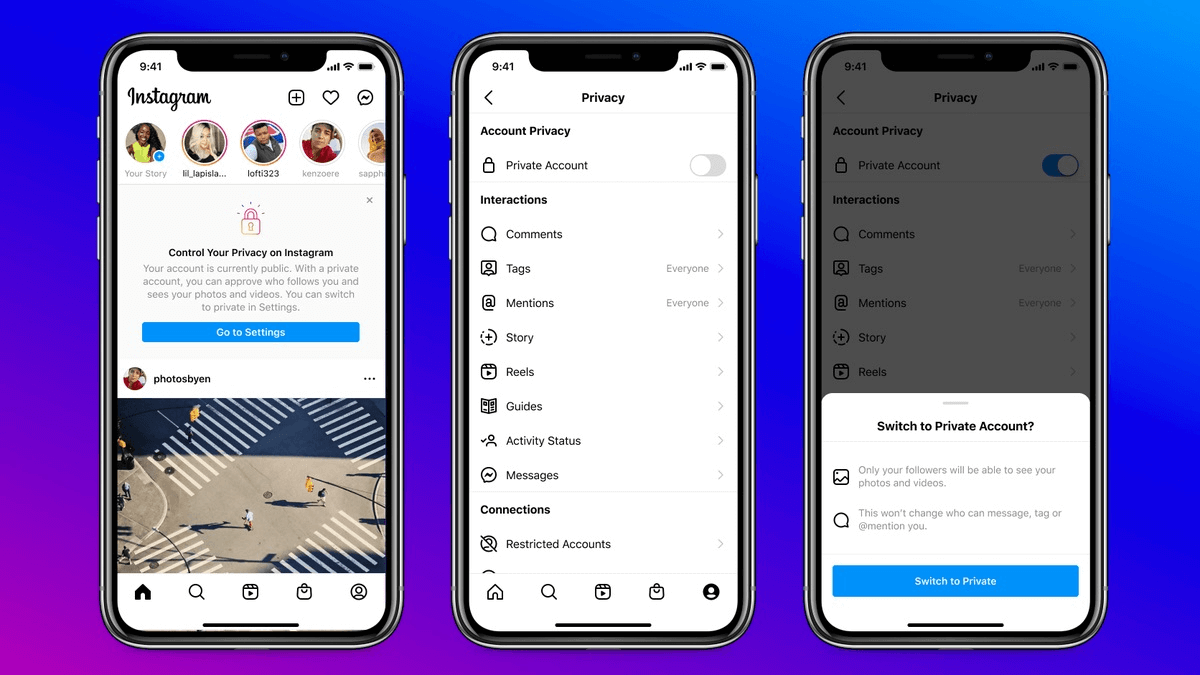 Instagram 帐户注册时,未满 16 岁的未成年人默认使用私人帐户,仅粉丝才能查看其发布的信息,在平台内容分发和互动上与成年人帐户进行隔离。当用户更改成公共帐户时,会给到提示强调私人帐户的好处。