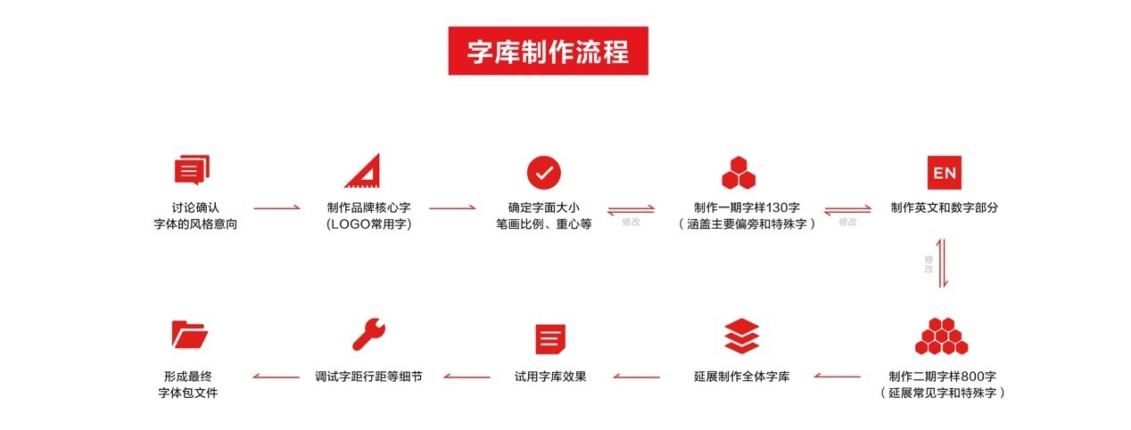 就在京东字体的造字工程陷入困局时,市场部刚好找到我们,提出了与专业字库公司合作定制京东品牌字体的计划,从而推进品牌升级。我们与市场部一拍即合,确定了与方正的合作。于是,整个字库的创作主力转到了方正身上,而我们主要承担掌舵的角色,整个字库的制作也开始向专业化、规模化、系统化发展,生产速度更是呈现出爆炸性增长。