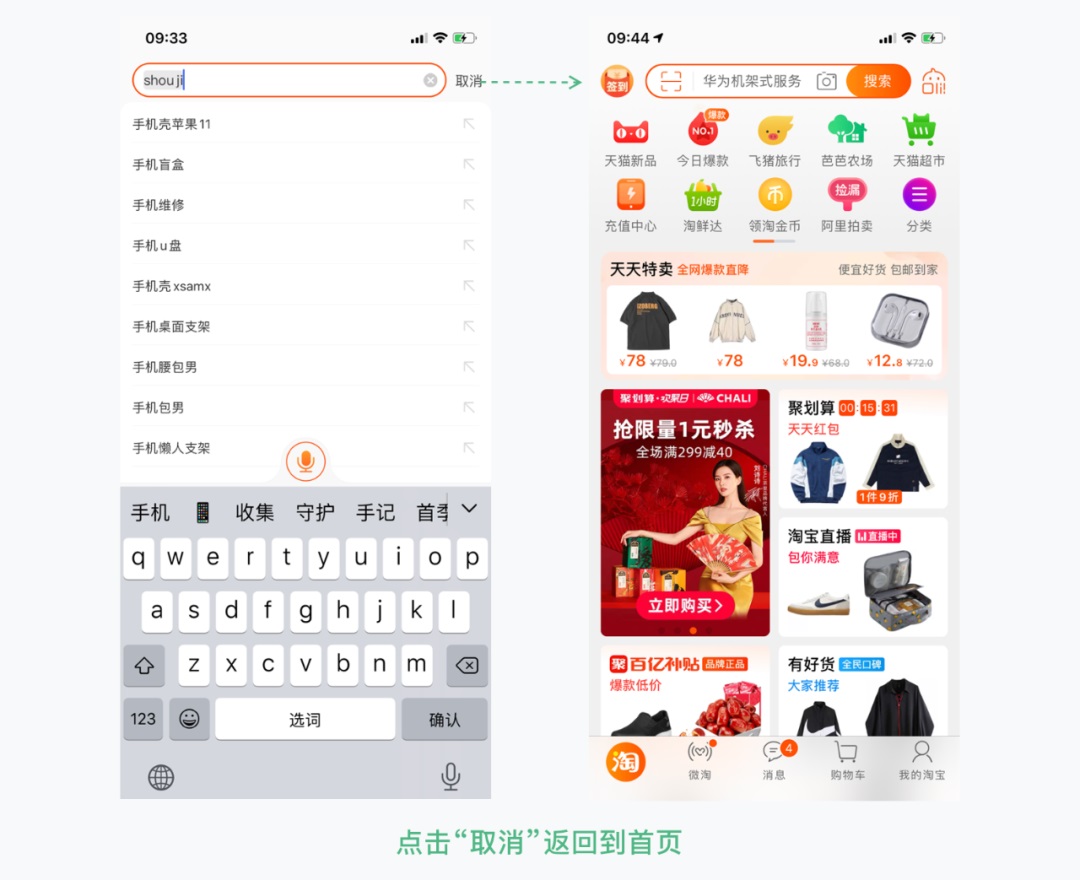 △ 在淘宝中输入“shouji”或“souji”,淘宝会根据拼音给出“手机”的搜索结果,但仍保留原标签,方便用户再次点击搜索;输入“手ji”时,会直接给出“手机”标签,这种差异化的反馈能更好的为用户服务。
