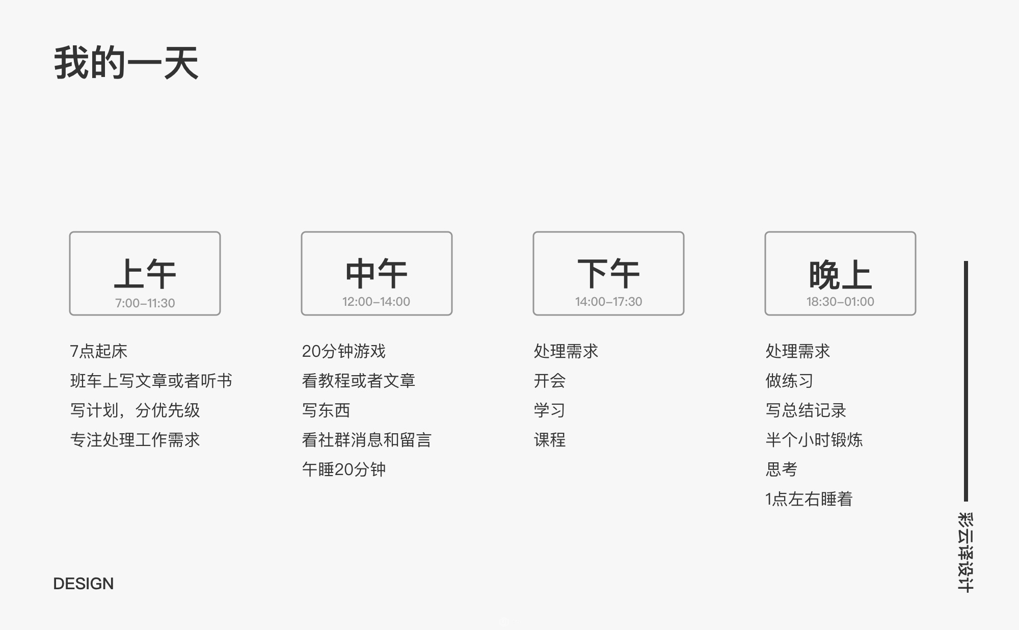 我每天早上大概7点左右起床,然后在班车上写文章或者听书,大概9点到工位,然后会写下一天的计划和优先级,精确到小时,接着就会按计划专心处理需求了。中午一般会玩20分钟游戏,看看教程或者文章,写点东西,处理社群和留言,然后1点40左右午睡20分钟。
