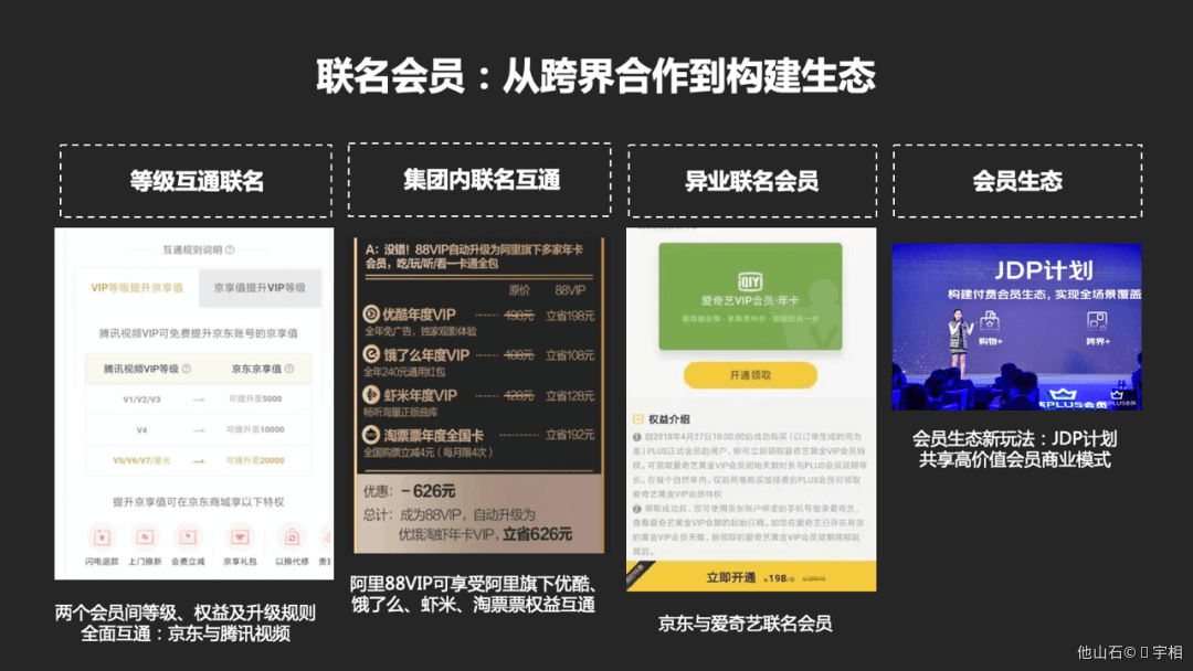 典型代表是阿里88会员,阿里88会员把多重会员身份融为一体的“一卡通” 既涵盖了阿里巴巴旗下所有核心服务,也联合了阿里平台上的国内外大牌提供的一系列复合权益。用户只要买一个88会员,就可以享受淘宝、饿了吗、优酷、虾米、淘票票多个会员,从用户角度说,会员的价值大大提升;从阿里来看,能把所有的高价值用户尽量锁在阿里生态内,而且能够带动虾米和淘票票这样相对弱势的业务发展,一举三得。