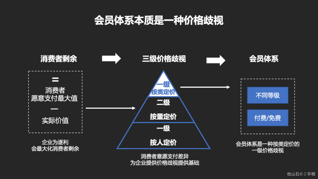而会员体系,是对不同的消费群体,制定不同的服务及定价策略,用户花钱更多,可以享受更高的折扣和更好的服务,其核心目的,是企业为了追求消费者剩余的最大化。因此,会员体系本质上,是企业为追求消费者剩余最大化,采取的一种价格歧视策略。