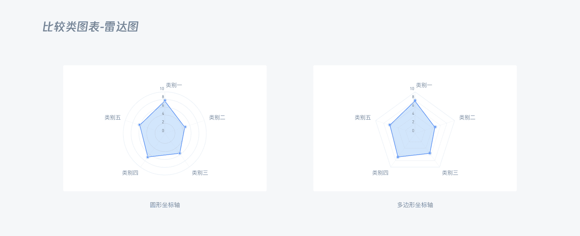 常用于一些多维的性能数据,如综合评分,也可用于多组多维度对比。