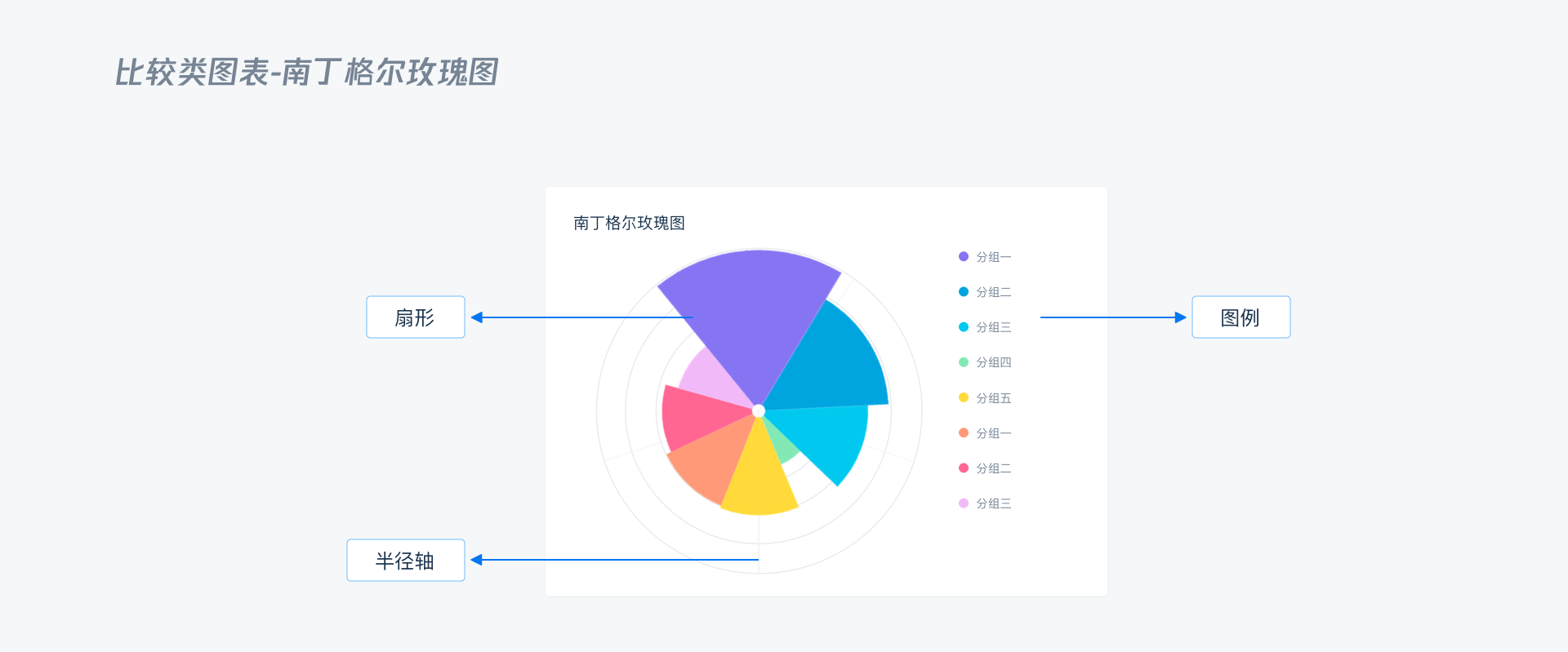 由于半径和面积的关系是平方的关系,南丁格尔玫瑰图会将数据的比例大小夸大,尤其适合对比分类数据的数值大小。