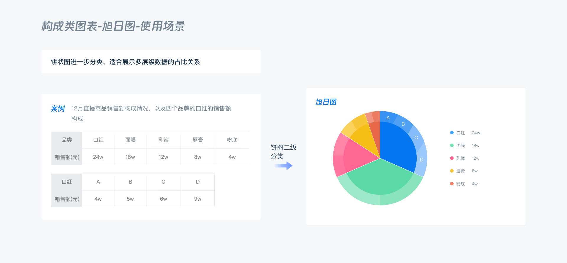 饼状图类目进一步分类,适合展示多层级数据的占比关系,能表达清晰的层级和归属关系,以父子层次结构来显示数据构成情况 ,离圆心越近,代表的层级越高,下一层级的总和构成上一层级。