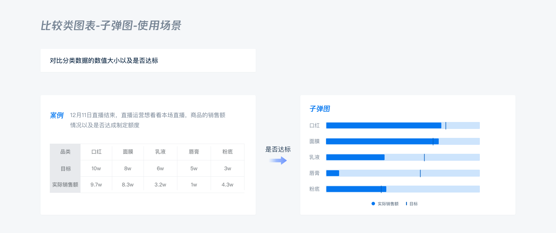 子弹图的样子很像子弹射出后带出的轨道,所以称为子弹图 ,其无修饰的线性表达方式使我们能够在狭小的空间中表达丰富的数据信息,线性的信息表达方式与我们习以为常的文字阅读相似,相对于圆形构图的信息表达,在信息传递上有更大的效能优势。