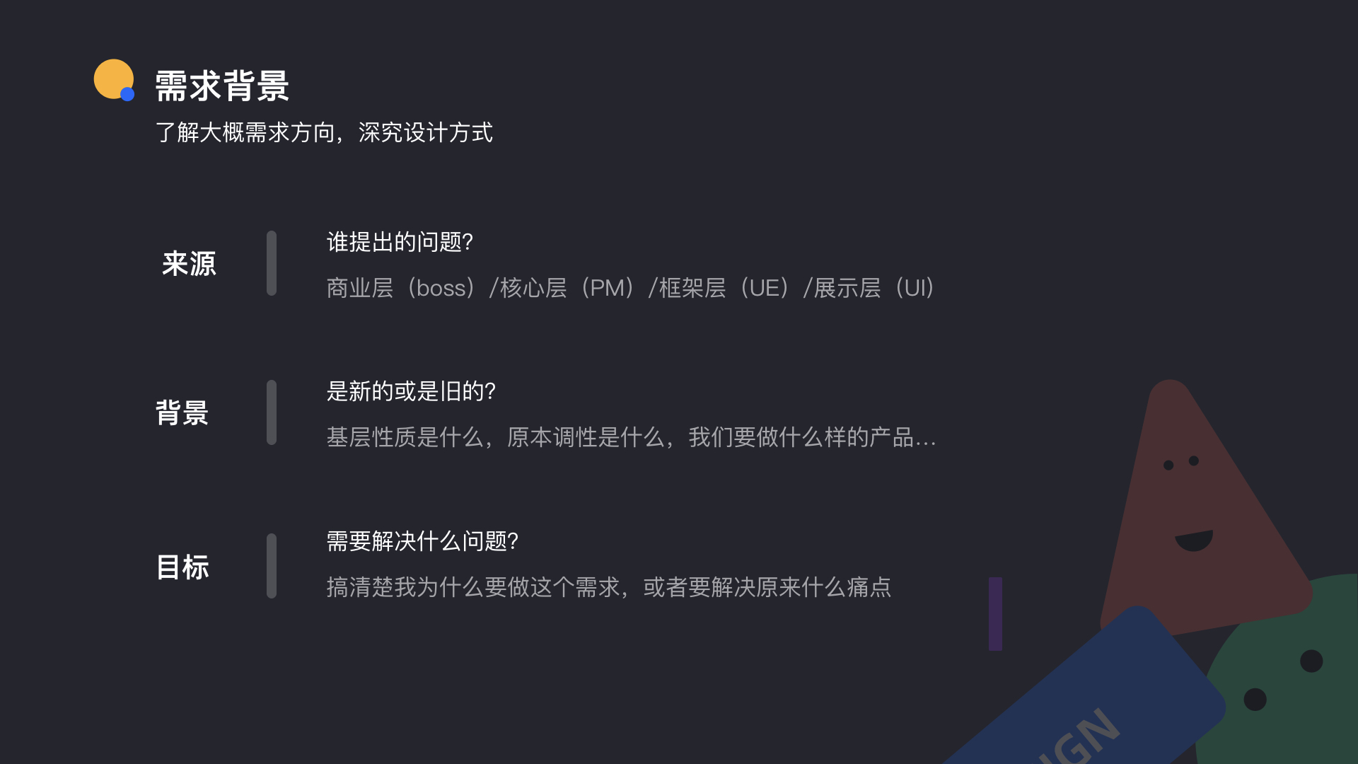 讲清楚谁给的需求,需要解决什么问题,是在原来的基础上不变动逻辑的情况下增加了什么达到了什么目的,才让你的叙述更完整,听起来更有逻辑。如果是一项新的需求,没有背景,那还得从设计分析说起,设计分析就是让你更专业的去做事,设计分析分为——用户分析,设计目标,和设计手段三个要点:
