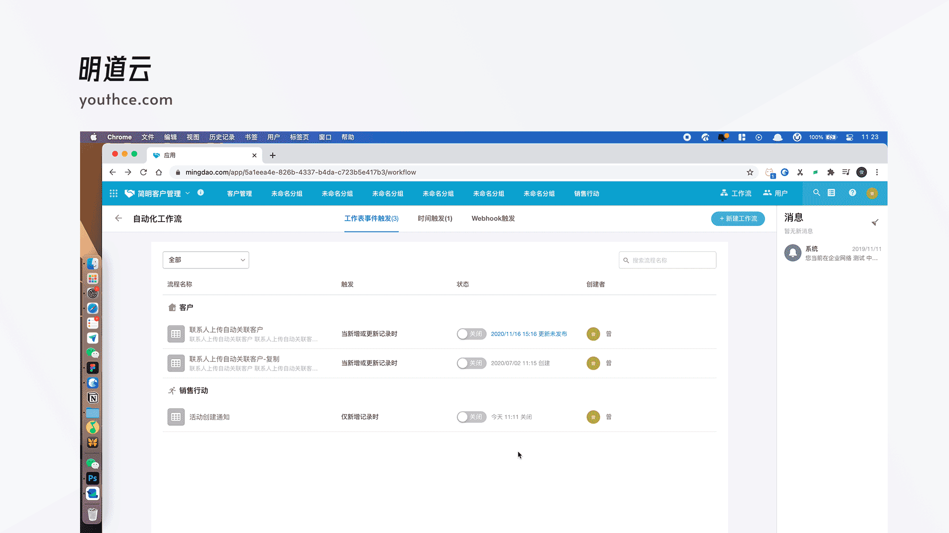 因为开关的权重更高,状态也更为明确,因此它的出现多为一些需要系统校验的操作,对于用户不满足条件时,需要进行禁止的提示。比如在明道云的工作流列表中,用户便可使用开关对流程进行快速开启,不满足条件时,会有提示弹窗进行提示,并能让用户快速跳转进行修改操作。