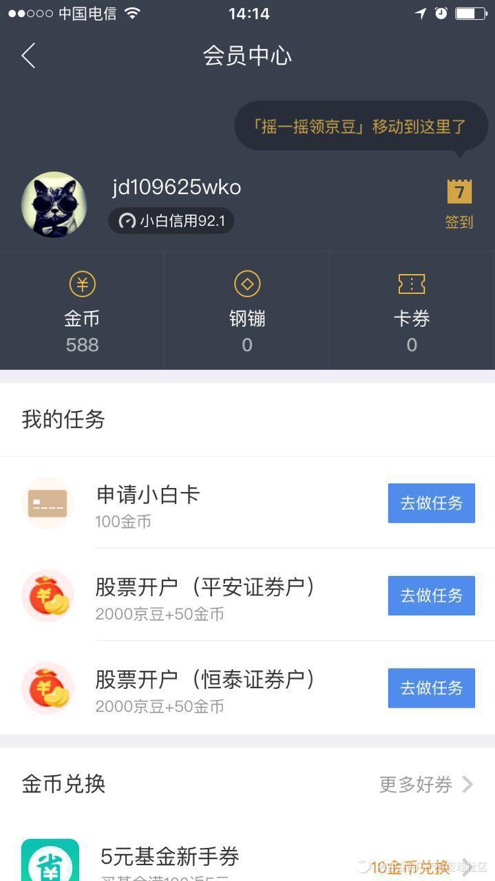 在上右图不难看到,头像昵称下方是用户的小白信用值,右侧的签到跳转金豆的领取,以及下方的金币、钢蹦等,都可以归为京东金融的会员积分体系。