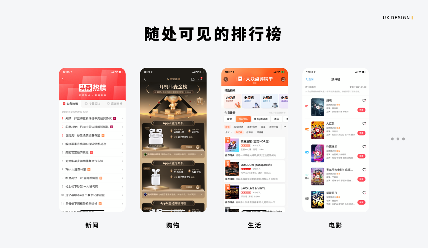 榜单的交互框架上有多种结构,信息呈现上也各有不同。需要根据自身产品采用适合的设计方式,结构上避免散乱、信息上避免过多的信息干扰。